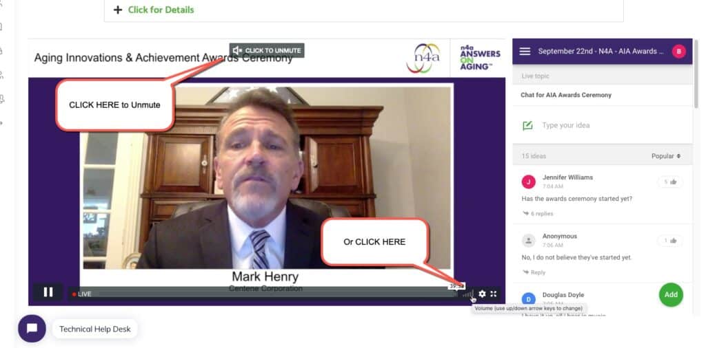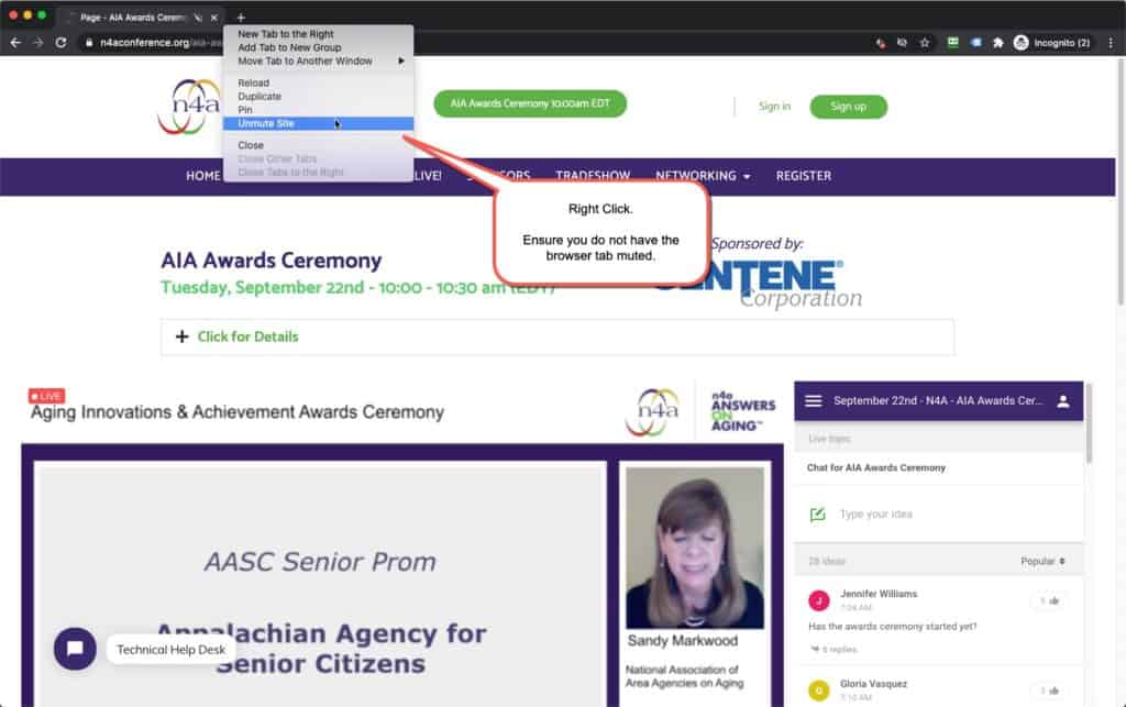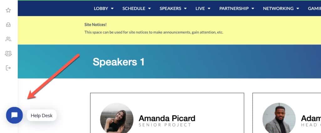Beginning 2 hours prior to and throughout the event, there will be a Live Tech Support Chat Widget in the bottom lefthand corner with representatives on hand to assist. Simply click on the bubble to start a chat.